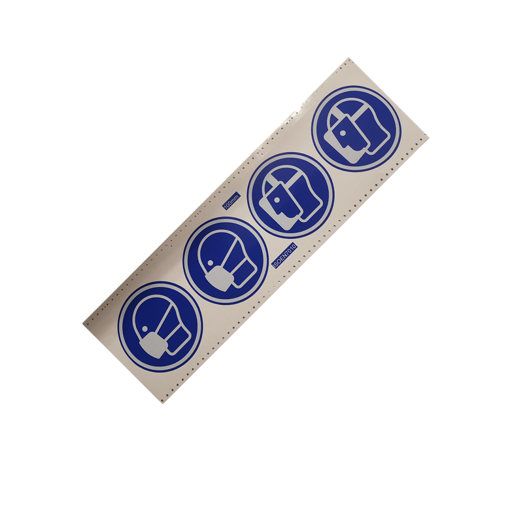 Bogen mit 4 Gebotsschilder als Aufkleber, 2 Stk. leichten Atemschutz tragen und 2 Stk. Gesichtsschutz tragen
